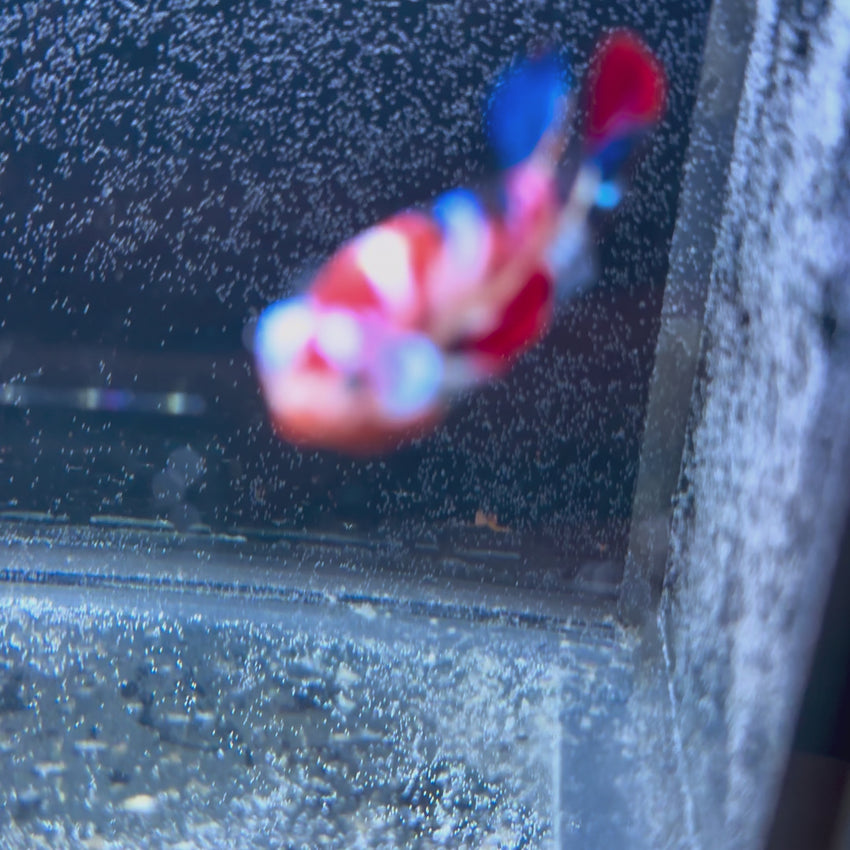 This Multicolor HMPK is a high-energy, high-contrast display fish—bold red panels, electric-blue fins, and iridescent “candy-scale” shimmer that flashes under light. The short-fin HMPK form keeps everything sharp and athletic while still delivering a strong, confident presence in the tank.