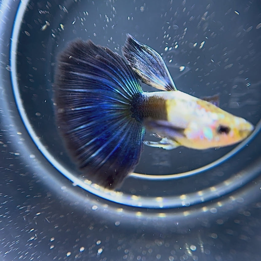 Silverado HB Blue guppies feature a metallic silver body combined with a half-black pattern and rich blue tones. Think chrome and midnight blue on a tiny show fish.