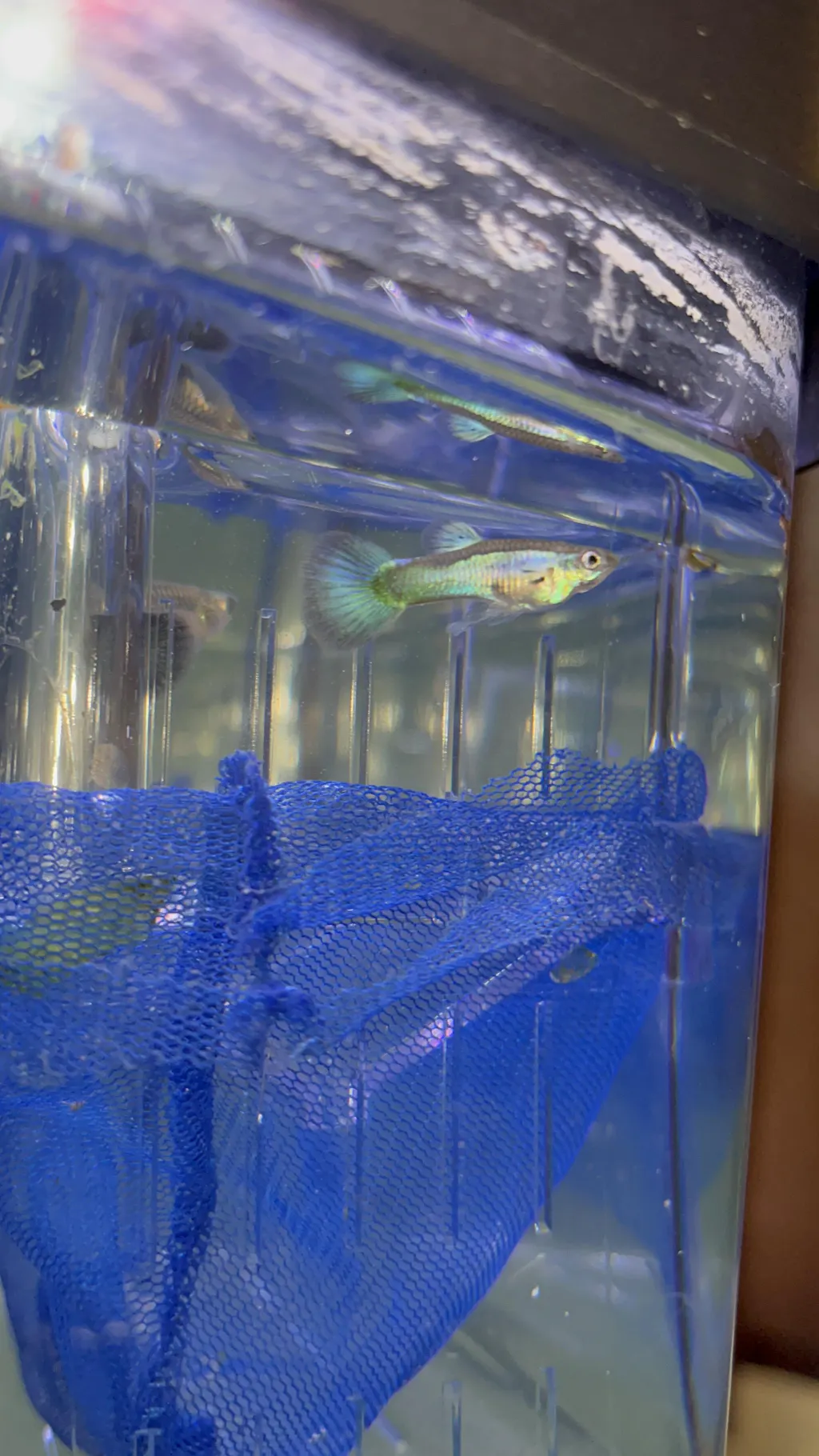 Full Metallic Blue Guppies are coated head-to-tail in intense metallic blue with cyan highlights. Under aquarium lights they shimmer and shift, turning any tank into a cool, electric display.